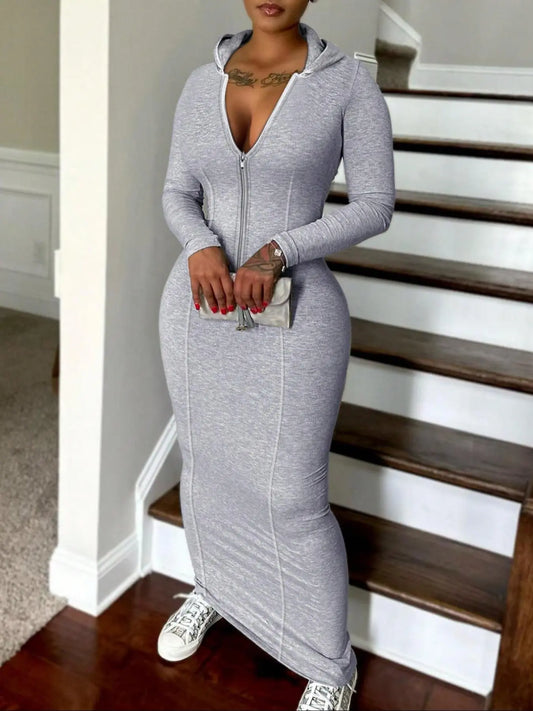 Chic Women's Solid Zip-Up Hooded Bodycon Dress - Casual Long Sleeve Ribbed Style for Fall & Winter Daily Wear